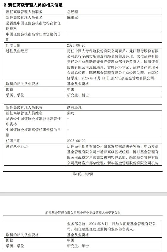 除总经理变更外,汇泉基金还新任命了一位副总经理柴玏。